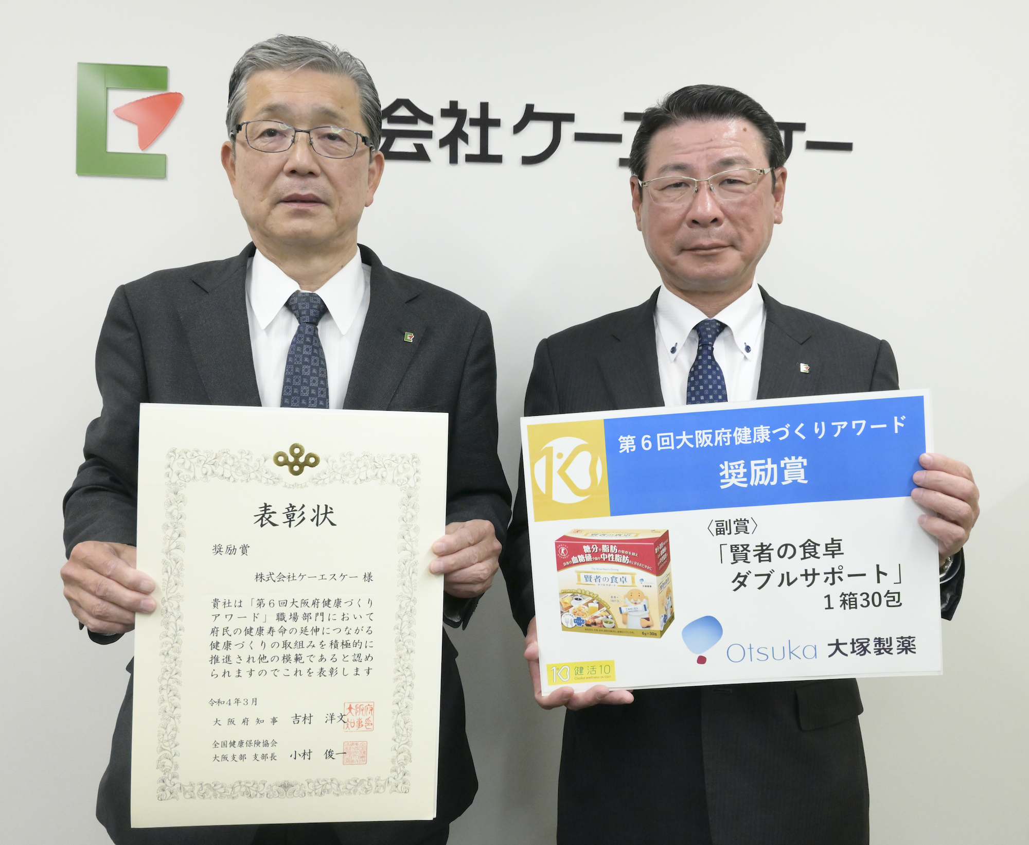 大阪府は、府内における自主的、主体的な健康づくり活動の奨励・普及を図るため、職場や地域において積極的に健康づくり活動を行っている団体を表彰する「大阪府健康づくりアワード」を実施しています。当社は、社員の検診受診率100%を目指し様々な取り組みを行ったり、がん検診啓発活動として全社員を対象に自社制作したe-ラーニング研修を実施したり、ロコモティブシンドローム予防推進活動を行ったりと、社員や地域の皆さんの健康づくりに継続的に取り組んでいます。