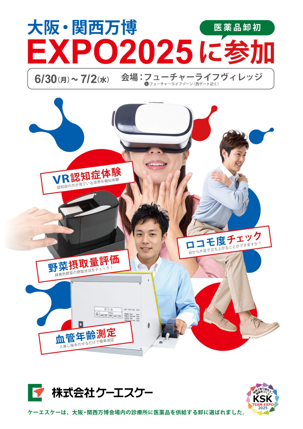 ケーエスケーは、大阪・関西万博EXPO2025に、医薬流通企業(医薬品卸)として、業界初参加します。 会場ではVRを使用した認知症体験や野菜摂取量評価、血管年齢測定、ロコモ度チェックなどを実施します。 ぜひご来場ください。