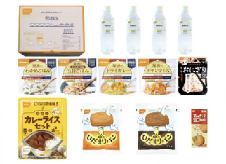 - アルファ米やおにぎり、パン、カレー、水など、さまざまな商品を用意。